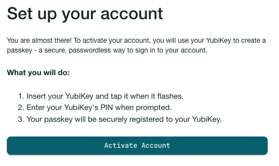 In the setup dialog that opens, click Activate Account. When prompted, tap your YubiKey and provide the PIN associated with the YubiKey