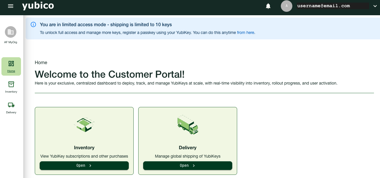 When successfully logged in you will be taken to the Home page for your organization where you can see your initial purchases and YubiKey license inventories. Since you have not yet registered a YubiKey, you will be notified that you are in “limited access mode” with limited feature access.