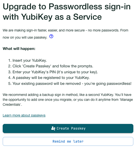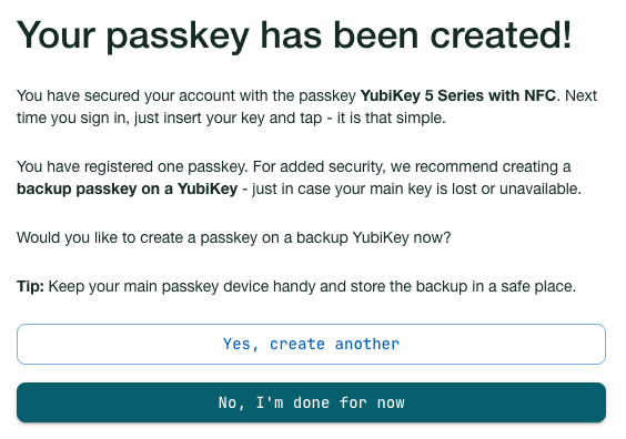 You will be prompted to register an additional YubiKey as a backup to avoid losing access to the Customer Portal if the original key is lost. This can be done at any time. Click Yes, create another to register a spare YubiKey and follow the instructions. Click No, I’m done for now to continue without registering a spare key.