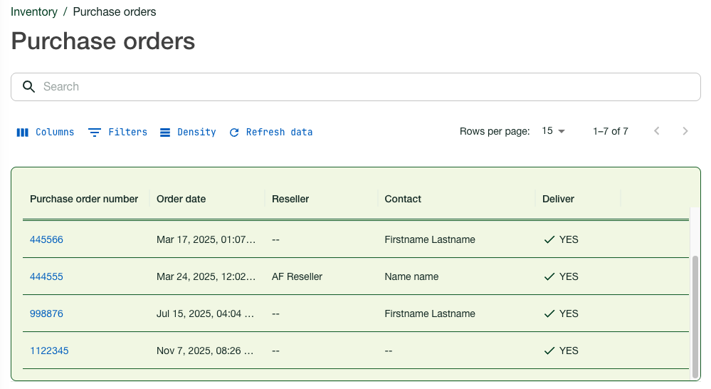 To view purchase orders for your organization, in the Customer Portal left menu, click Inventory > Purchase orders in the left menu to open the Purchase orders page. To locate a specific purchase order, use the search bar at the top, click Filters to filter the list of purchase orders by one or more fields.