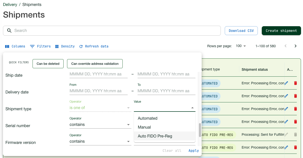 - Use the Filters function to filter out pre-registered shipments. Click Filters, select “Auto FIDO Pre-reg” as Shipment type, and click Apply.