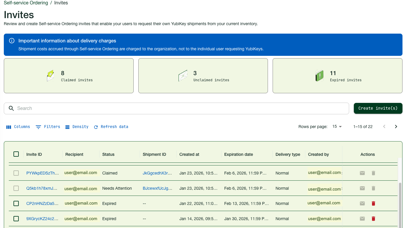 The following outlines the steps to set up Self-service Ordering and manage invites. This is typically done by an IT administrator responsible for distributing YubiKeys in an organization.