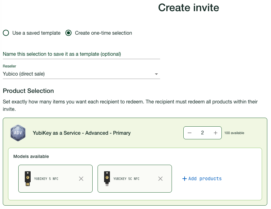 Using product selection templates you can create invites reusing information about product selections and quantities, for example to send the same set of YubiKeys to new employees joining your organization.