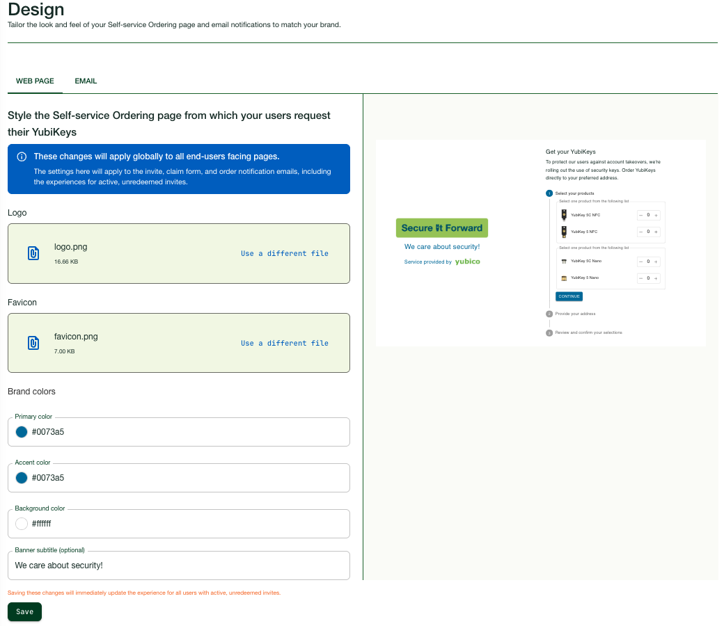 The Self-service Ordering web page is where the recipient is directed when clicking the link in the invite email to claim their YubiKeys. You can brand the design of both the Self-service Ordering web page and the invite emails, to match your organization’s branding guidelines.