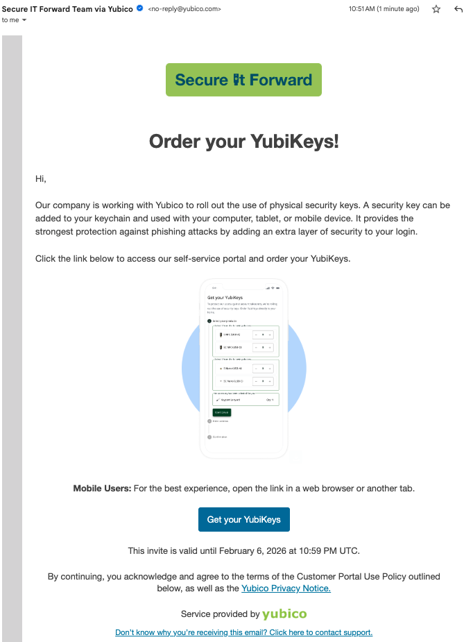 Recipients do not need to have a Yubico account, you only provide their email address when creating their invite. An email with a link to your branded Self-service Ordering web page is sent to the recipient, who authenticates using a one-time code (OTC) also sent to the email address.