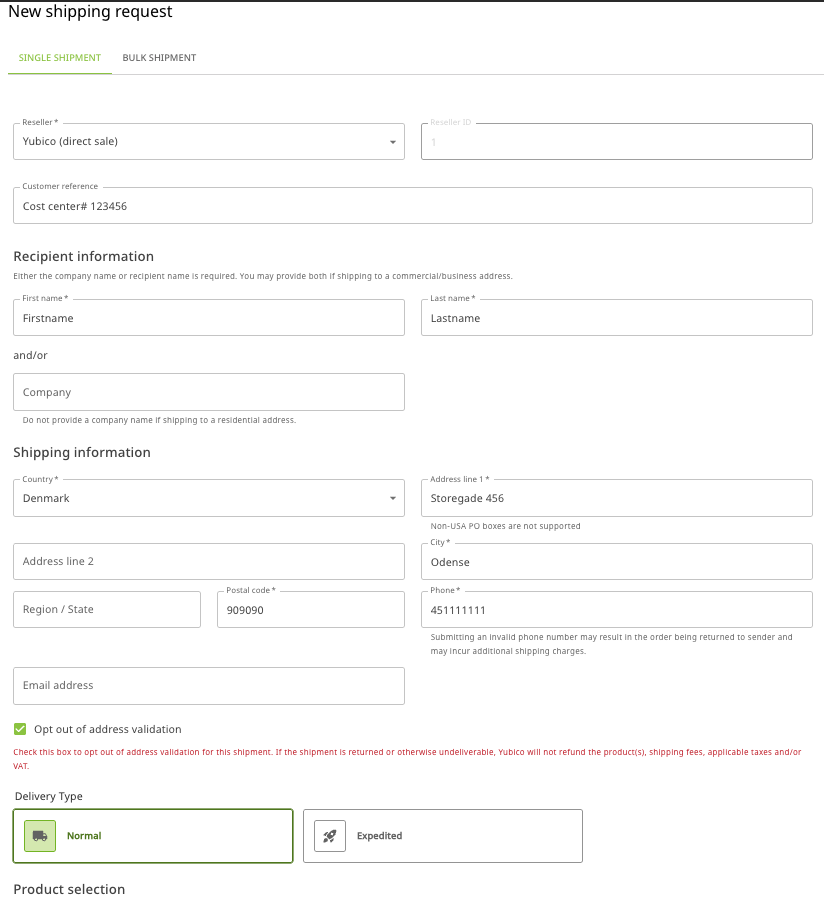 Select Opt out of address validation to override the Yubico address validation service if applicable, see Overriding Address Validation.