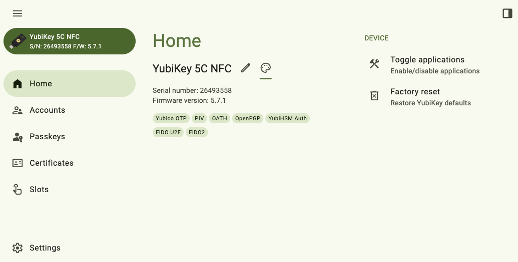 The Home page displays a wealth of important information about the connected YubiKey, including:
